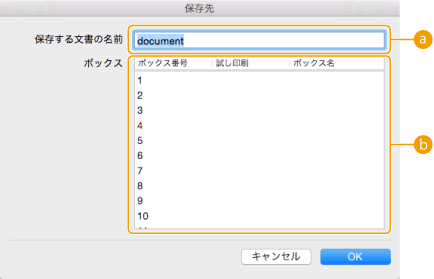 保存先のユーザーボックスを指定します。キーボードの[COMMAND]キーを押しながらクリックすると、複数のユーザーボックスを選ぶことができ、同じファイルが各ユーザーボックスに保存されます。