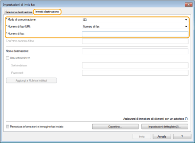 Fare clic sulla scheda [Immetti destinazione] e specificare la modalità di comunicazione e il numero di fax in uso.