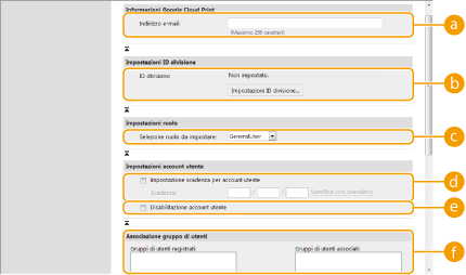 Quando si desidera assegnare l'utente ad un gruppo, selezionare un gruppo di utenti registrato dall'elenco e fare clic su [Aggiungi]. Questa impostazione non viene visualizzata quando si utilizzano gli ID divisione come gruppi di utenti. Configurazione dei metodi di accesso dell'utente e dei dispositivi di autenticazione