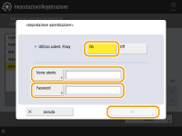 Premere questo per impostare le informazioni di autenticazione quando si utilizza la funzione di autenticazione di un server proxy. Premere <On> sulla schermata visualizzata, inserire il nome utente e la password per l'autenticazione proxy e premere <OK>.