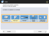 El número de opciones incluidas en la pantalla Funciones básicas y la ubicación donde aparecen varía según las funciones. No se mostrará un botón de acceso directo si <No asignado> se establece como acceso directo. El límite del número de accesos directos para <Opciones> que puede registrar es el siguiente. Copia (básica): 5 Copia (exprés): 6 Fax: 4 Leer y enviar: 2 Si ha cambiado la pantalla de Funciones básicas de copia a la pantalla de Copia exprés (Cambiar las opciones rápidamente (Pantalla de copia exprés)), seleccione el botón en el paso 3 y pulse <Guardar>. |