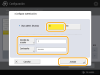 <Configurar autenticación>Para utilizar la función de autenticación del servidor proxy, pulse este botón y configure la información de autenticación. En la pantalla que aparecerá, pulse <Sí>, introduzca el nombre de usuario y la contraseña para utilizar la autenticación de proxy, y pulse <Aceptar>.