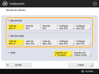 3 | Especifique el puerto al que aplicar IPSec. Pulse <Especificar por n.º de puerto> para utilizar los números de puerto al especificar los puertos a los que se aplica IPSec. Seleccione <Todos los puertos> para aplicar IPSec a todos los números de puerto. Para aplicar IPSec a un número de puerto concreto, pulse <Puerto único> e introduzca el número de puerto. Tras especificar los puertos, pulse <Aceptar>. Especifique el puerto de este equipo en <Puerto local>, y especifique el puerto del interlocutor de la comunicación en <Puerto remoto>. ![]() Pulse <Especificar por nombre servicio> para utilizar nombres de servicio al especificar los puertos a los que se aplica IPSec. Seleccione el servicio en la lista, pulse <Activ./Desac. servicio> para activarlo (<Sí>) y pulse <Aceptar>. ![]() | ||||||||||||||