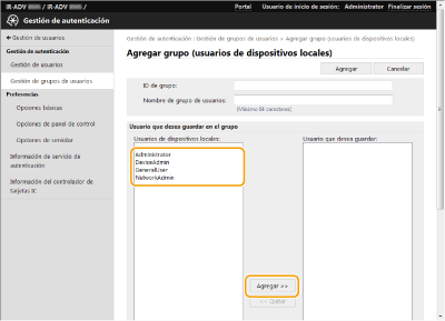 Haga clic en [Agregar grupo (usuarios de dispositivos locales)...] o [Agregar grupo (otros usuarios)...].