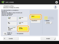 ![]() | Este modo permite realizar un OCR (reconocimiento óptico de caracteres) para extraer datos que puedan reconocerse como texto a partir de una imagen leída y crear así un archivo PDF/OOXML (pptx/docx) que permita realizar búsquedas. También puede establecer <Compacto> si selecciona PDF como formato de archivo. Para información acerca de los productos opcionales necesarios para utilizar esta función y los formatos de archivo, consulte Opciones del sistema |