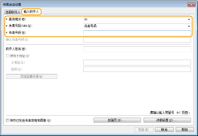 单击[输入收件人]选项卡,并指定要使用的通信模式和传真号码。