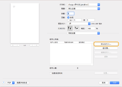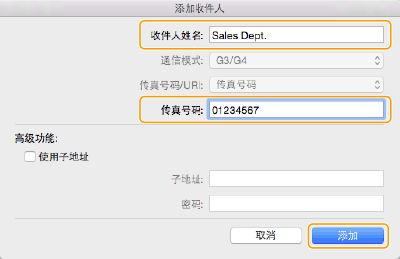 在[收件人姓名]中输入接收方名称,在[传真号码]中输入传真号码,然后单击[添加]