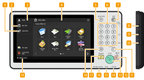 이 단원에서는 조작 패널의 키의 이름 및 용도를 설명합니다.