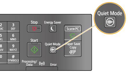 When in quiet modeWhen the machine enters quiet mode, lights up green.When quiet mode is enabledThe operation of functions becomes slower. When the machine cannot enter quiet modeThe machine is in Special Printing Mode A particular paper size or paper type is specified |
