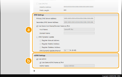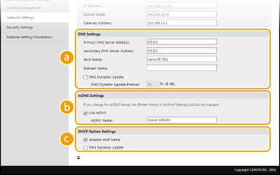 2 | Configure IPv4 DNS settings. ![]() [DNS Settings][Primary DNS Server Address] Enter the IP address of a DNS server. [Secondary DNS Server Address] Enter the IP address of a secondary DNS server, if any. [Host Name] Enter up to 47 alphanumeric characters for the host name of the machine that is to be registered to the DNS server. [Domain Name] Enter up to 47 alphanumeric characters for the name of the domain the machine belongs to, such as "example.com." [DNS Dynamic Update] Select the check box to dynamically update the DNS records whenever the machine's IP address is changed. When specifying the interval between updates, enter the time in hours in the [DNS Dynamic Update Interval] text box. [mDNS Settings][Use mDNS] Adopted by Bonjour, mDNS (multicast DNS) is a protocol for associating a host name with an IP address without using DNS. Select the check box to enable mDNS and enter the mDNS name in the [mDNS Name] text box. [DHCP Option Settings][Acquire Host Name] Select the check box to enable Option 12 to obtain the host name from the DHCP server. [DNS Dynamic Update] Select the check box to enable Option 81 to dynamically update the DNS records through the DHCP server. |