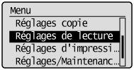 . Ces réglages indiquent l'ordinateur sur lequel les images numérisées sont enregistrées, le type de numérisation (couleur ou noir et blanc) et le format de fichier (PDF ou JPEG). La mémorisation de ces réglages permet de numériser des documents sur l'ordinateur de votre choix par la simple pression d'une touche. Pour examiner les réglages mémorisés, sélectionnez <Confirmer destinataire>. Numérisation à l'aide de la touche [Scan -> PC (LECT -> PC)]Mémoriser Scan -> PC Désactivé ![]() Connexion USB Lecture couleur Lecture N&B Personnalisé 1 Personnalisé 2 Connexion réseau Lecture couleur Lecture N&B Personnalisé 1 Personnalisé 2 Confirmer destinataire Scan -> PC |