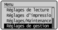 Initialisation du menuPréférences Réglages horloge Réglages communs Réglages copie Réglages de lecture Réglages d'impression Réglages/Maintenance Réglages de gestion du système Tout initialiser |