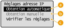 Sélectionnez ce réglage pour attribuer automatiquement une adresse IP via un protocole tel que DHCP. Lorsque <Obtention automatique : Activé> s'affiche, l'adressage automatique est activé.