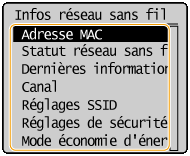 Il est possible d'afficher <Statut réseau sans fil> et <Dernières informations d'erreurs> en appuyant sur . Appuyez sur   <Informations réseau>  <Méthode de connexion réseau> et sélectionnez le réglage qui vous intéresse.