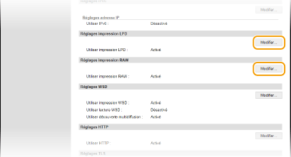 Configurez les protocoles servant à imprimer des documents à partir d'un ordinateur relié au réseau. Les protocoles pris en charge par l'appareil incluent les protocoles LPD, RAW et WSD (Web Services on Devices).