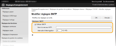 ![]() | Le protocole SNTP (Simple Network Time Protocol) permet de régler l'horloge système avec le serveur de temps du réseau. Le protocole sert généralement à synchroniser l'appareil et un serveur, par exemple, si l'appareil doit accéder à un serveur LDAP. L'heure est calculée selon le temps universel coordonné (UTC), aussi prenez soin de définir le fuseau horaire avant de configurer SNTP (Réglages date/heure). L'IU distante permet de spécifier les réglages SNTP. |