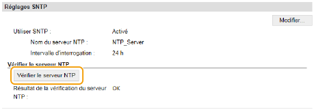 Test des communications avec le serveur NTP/SNTPVous pouvez tester les communications entre l'appareil et le serveur de temps enregistré via SNTP. Accédez à [Réglages/Enregistrement] [Réglages réseau] [Réglages TCP/IP] et cliquez sur [Vérifier le serveur NTP] dans [Réglages SNTP]. Si une connexion est établie, l'écran illustré ci-dessous s'affiche. Notez que cette opération ne procède pas au réglage de l'horloge système.![]() |