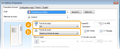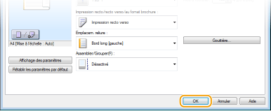 Interface utilisateur cliquableVous pouvez, de façon simple et intuitive, définir la mise en page ou encore la position de reliure dans l'aperçu. Pour en savoir plus, cliquez sur [Aide], dans l'écran du pilote d'imprimante. ![]() |