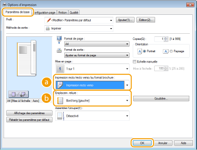 Sélectionnez [Impression recto] ou [Impression recto verso] dans [Impression recto/recto verso/au format brochure ]