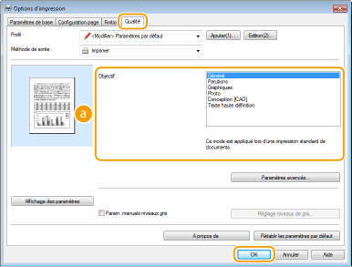Pour définir des paramètres détaillés pour chaque élément sélectionné dans [Objectif ], cliquez sur [Paramètres avancés]. Pour en savoir plus, cliquez sur [Aide], dans l'écran du pilote d'imprimante.