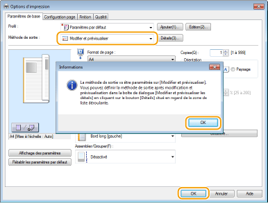 Sélectionnez [Modifier et prévisualiser], dans [Méthode de sortie ].