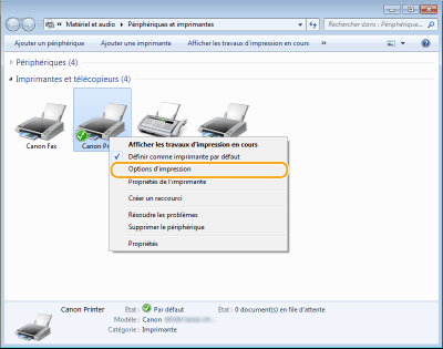 Effectuez un clic droit sur l'icône du pilote d'imprimante de cet appareil, puis cliquez sur [Options d'impression].