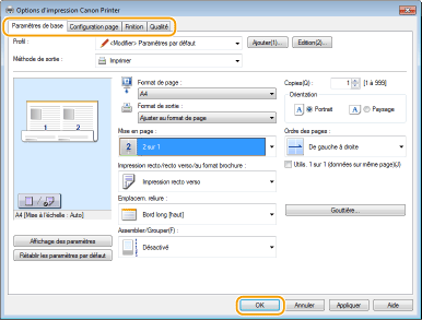 Cliquez sur les onglets [Paramètres de base], [Configuration page], [Finition ] ou [Qualité] pour définir les paramètres d'impression figurant sur chaque écran.