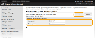 Cliquez sur [Réglages de sécurité]  [Réglages clé et certificat] ou [Réglages certificat CA].