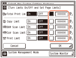 Press [] (Page Limit) next to [On]/[Off] of the desired function(s) → enter the page limit restriction using - (numeric keys).