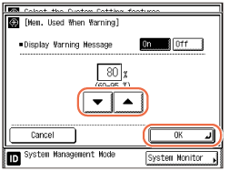 [On]: Displays an alert message when the memory consumption reaches the level to be specified in the next step. Press [OK] → go to the next step.