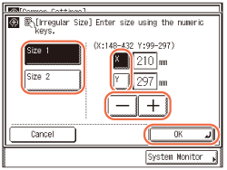 Podeu prémer [Mida 1] o [Mida 2] per especificar la mida del paper si els valors dels eixos horitzontal i vertical ja estan registrats prèviament. (Desament de mides de paper no estàndard)