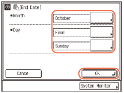 Especifiqueu la data final (mes, setmana i dia) de l'horari d'estiu mitjançant les llistes desplegables → premeu [Acceptar].