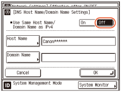 Press [Off] for <Use Same Host Name/Domain Name as IPv4>.