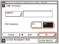 If you want the machine to notify the LAN Manager of its existence on the network, press [On] for <LM Announce>. Otherwise, press [Off].