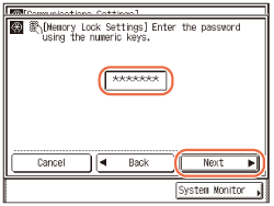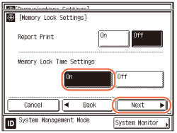 Press [On] for <Memory Lock Time Settings> → press [Next].