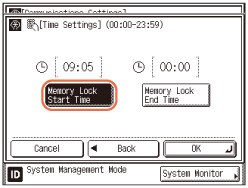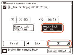 Press [Memory Lock End Time] → specify the time to exit the Memory Lock mode using