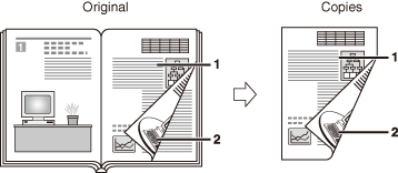 Ako koristite mod 1 na 2-strano kada je mod 2 na 1 u modu spajanja slika podešen na 'Uključeno' radi kopiranja originala od četiri stranice, dvije stranice originala bit će ispisane na jednu, a dvije na drugu stranu lista.