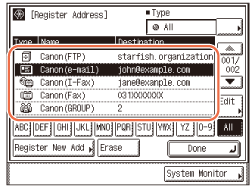 [Grupa]: Prikazuje odredišta registrirana kao grupna adresa. [Faks]: Prikazuje sva registrirana faks odredišta. [E-mail]: Prikazuje sva registrirana e-mail odredišta. [I-faks]: Prikazuje sva registrirana I-faks odredišta. [Datoteka]: Prikazuje sva odredišta registrirana kao datotečni poslužitelj. [Brzinska tipka]: Prikazuje sva odredišta registrirana pod brzinskim tipkama. |