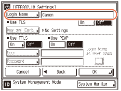 Press [User] → enter the user name (up to 24 characters) specified on the RADIUS server. If you want to set the login name as the user name, press [Login Name as User Name].