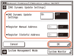 If your environment includes a dynamic DNS server and you want to automatically register the IPv6 address, host name, and domain name set for the machine in the DNS server using dynamic DNS updating, press [On] for <DNS Dynamic Update Settings>.