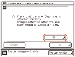 Changes made to Use Inner 2way Tray become effective when the machine is restarted. To restart the machine, turn it OFF, wait at least 10 seconds, and then turn it ON. For instructions on how to turn the machine ON and OFF, see Chapter 2, “Before You Start Using the Machine,” in the User’s Guide.