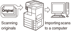 Díky funkci vzdáleného skenování můžete stroj používat jako klasický skener. Dokument můžete naskenovat na tomto stroji a poté číst jeho data na počítači v aplikaci kompatibilní se standardem TWAIN. Abyste mohli tuto funkci používat, stroj musí být připojen na síť IPv4 a na počítači musíte mít nainstalovaný software Color Network ScanGear*.