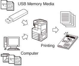 (Se hjælpen til printerdriveren.) Hvis du printer TIFF/JPEG-filer, kan du printe dem fra en USB-hukommelsesenhed ved at sætte den direkte i maskinen og vælge de ønskede billeder på touchpanelet.