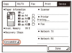 Tryk på [Forbrugsv.] for at få vist statussen for toner, overskudstoner og hæfteklammer.