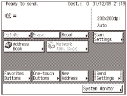 (SEND) for at skifte til det skærmbillede, som vises herunder, der hedder skærmbilledet Top (Send). Den startskærm, der vises (Send), varierer, afhængigt af det installerede tilbehør og de angivne indstillinger, som vist herunder.