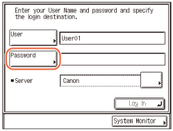 Hvis indstillingerne under <Godkendelsesmetode> i <SMTP-godkendelsesindstillinger> er konfigureret til at vise godkendelseskærmen, vises skærmbilledet Indtast netværkspassword, når du trykker på