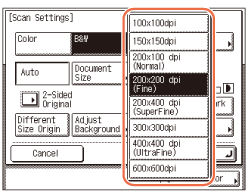 Vælger du [Farve] som farvestatus, kan du vælge [100×100dpi], [150×150dpi], [200×200dpi] eller [300×300dpi] som mulig opløsning.