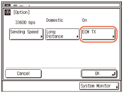 Sender dokumenter med ECM (Error Correction Mode). ECM mindsker effekten af system- og linjefejl under afsendelse og modtagelse, når der udveksles dokumenter med en anden faxmaskine, der understøtter ECM. For flere informationer skal du se Afsendelse med ECM (Error Correction Mode). Standardindstillingen er ‘Til’.