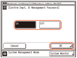 Changes made to Confirm Dept. ID Management Password become effective when the machine is restarted. To restart the machine, turn it OFF, wait at least 10 seconds, and then turn it ON. For instructions on how to turn the machine ON and OFF, see Chapter 2, “Before You Start Using the Machine,” in the User’s Guide.