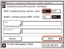 Press [Off] both for <SMTP Authentication (SMTP AUTH)> and <POP Authentication before Send> → press [Next].
